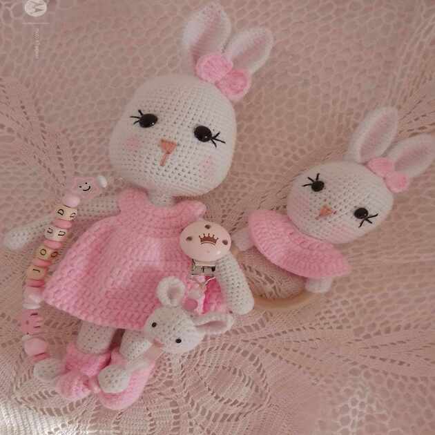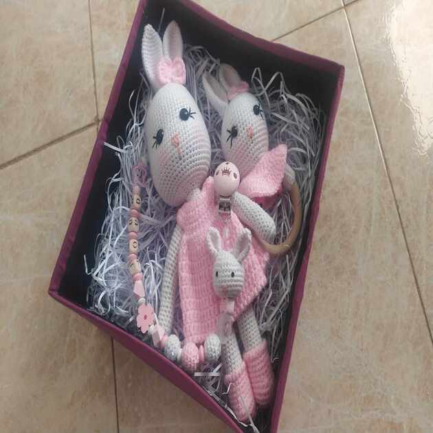 بوكس دمية الام الأرنب وصغارها صناعة كورشيه يدوية جزائرية متوفرة بعدة ألوان ، يحتوي البوكس على الدمية الام مرفوقة بإبنتها الصغيرة على شكل مصاصة ، بالإضافة على إكسسوار بيبي صغيرعلى شكل سوار، به أحرف صغيرة مربعة تحمل إسم الصغير يمكنكي وضعها على يد طفلتك الصغيرة، كما يمكنك إهداء هذا البوكس BOX كهدية للأطفال ، يمكنكم طلب كتابة اسم الطفل على الإكسسوار، صناعة يدوية 100% من خيوط لكليم الرفيعة الممتازة بلكروشيه يمكنكم طلب المنتج بالضغط على زر تأكيد الطلب من الموقع ، كما يمكنكم طلب ،إضافات أخرى على المنتج حسب اذواقكم .